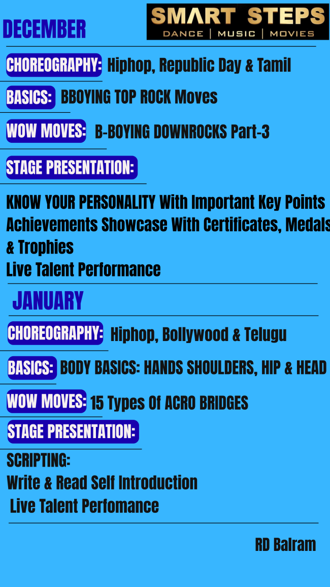 "We Set a Goal To Train Students, To Master 400+ Dance Basics, Practice 100+ Dance Stunts, Perform 15+ Choreography Concepts & Know 8 Presentation Skills With 19 Personality Developments Concepts"
